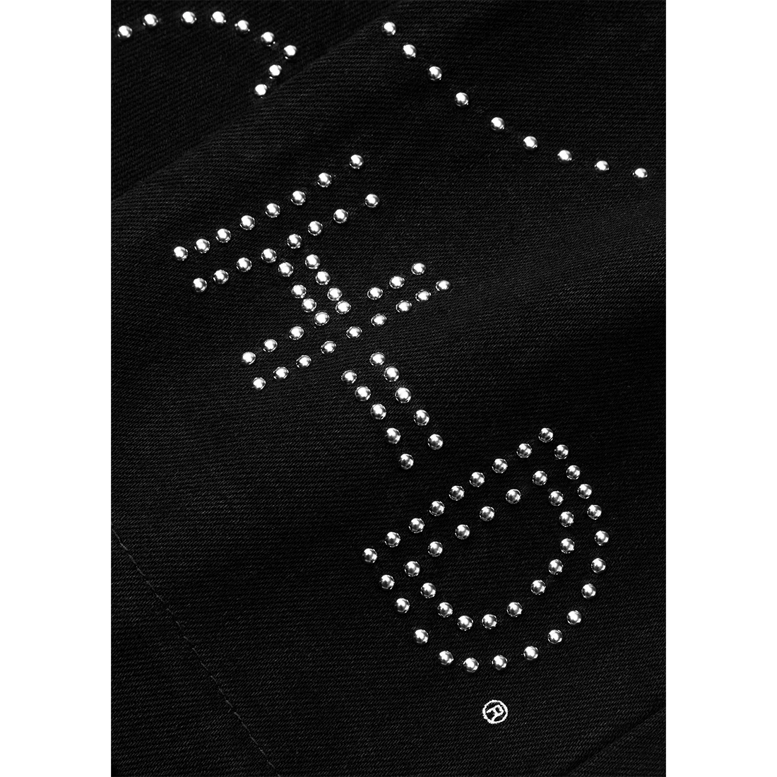these all-cotton denim pants deliver a relaxed fit with classic five-pocket styling and zip front fly. finished with custom metal studded artwork on the front legs for a distinctive look.